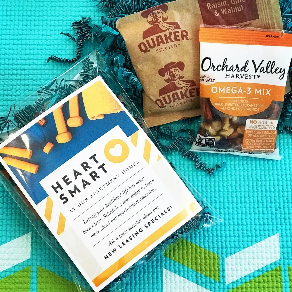 Offer heart-smart move-in gifts: gym bags full of healthy essentials (yoga mats, workout music, healthy snacks, fitness DVDs and more)!